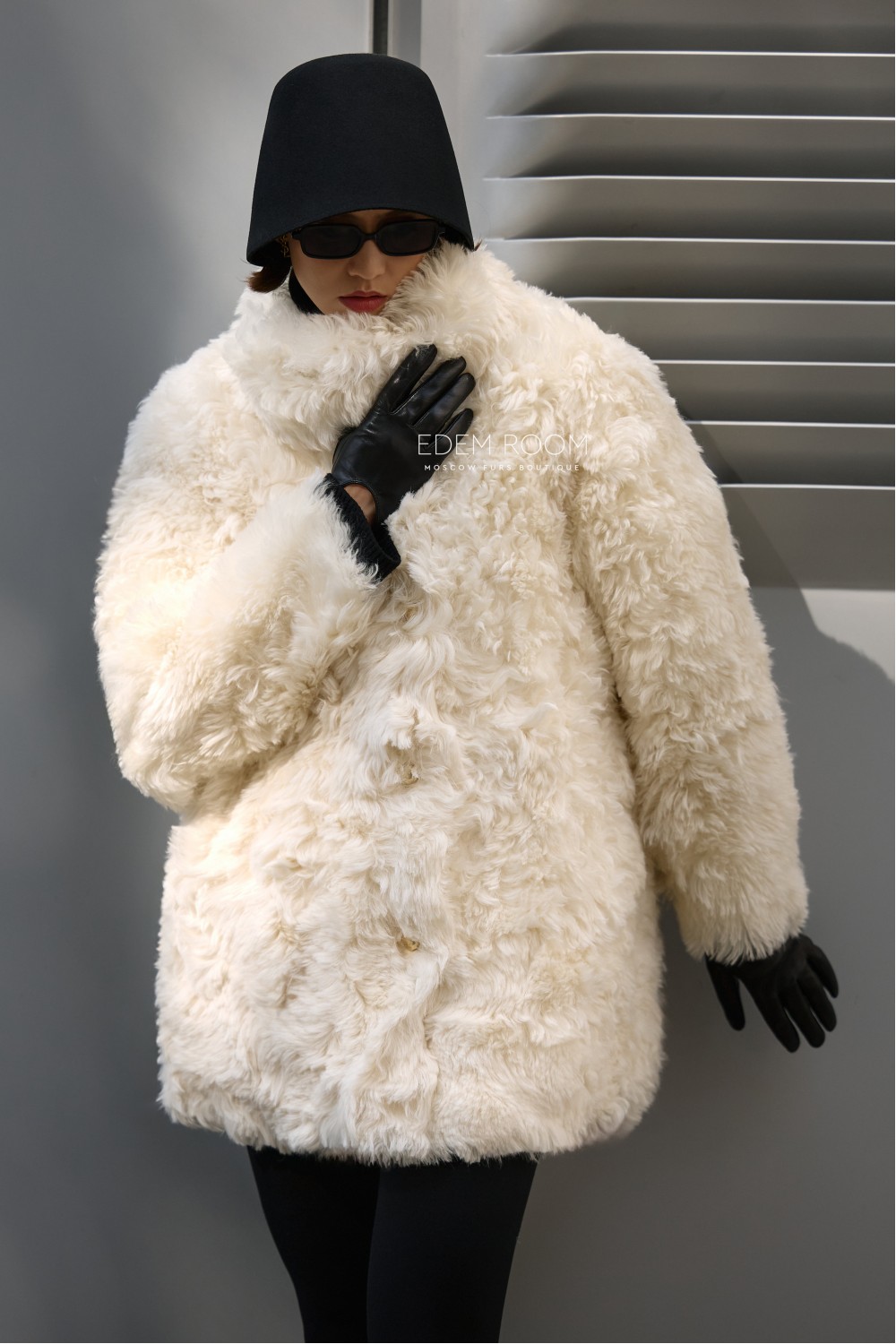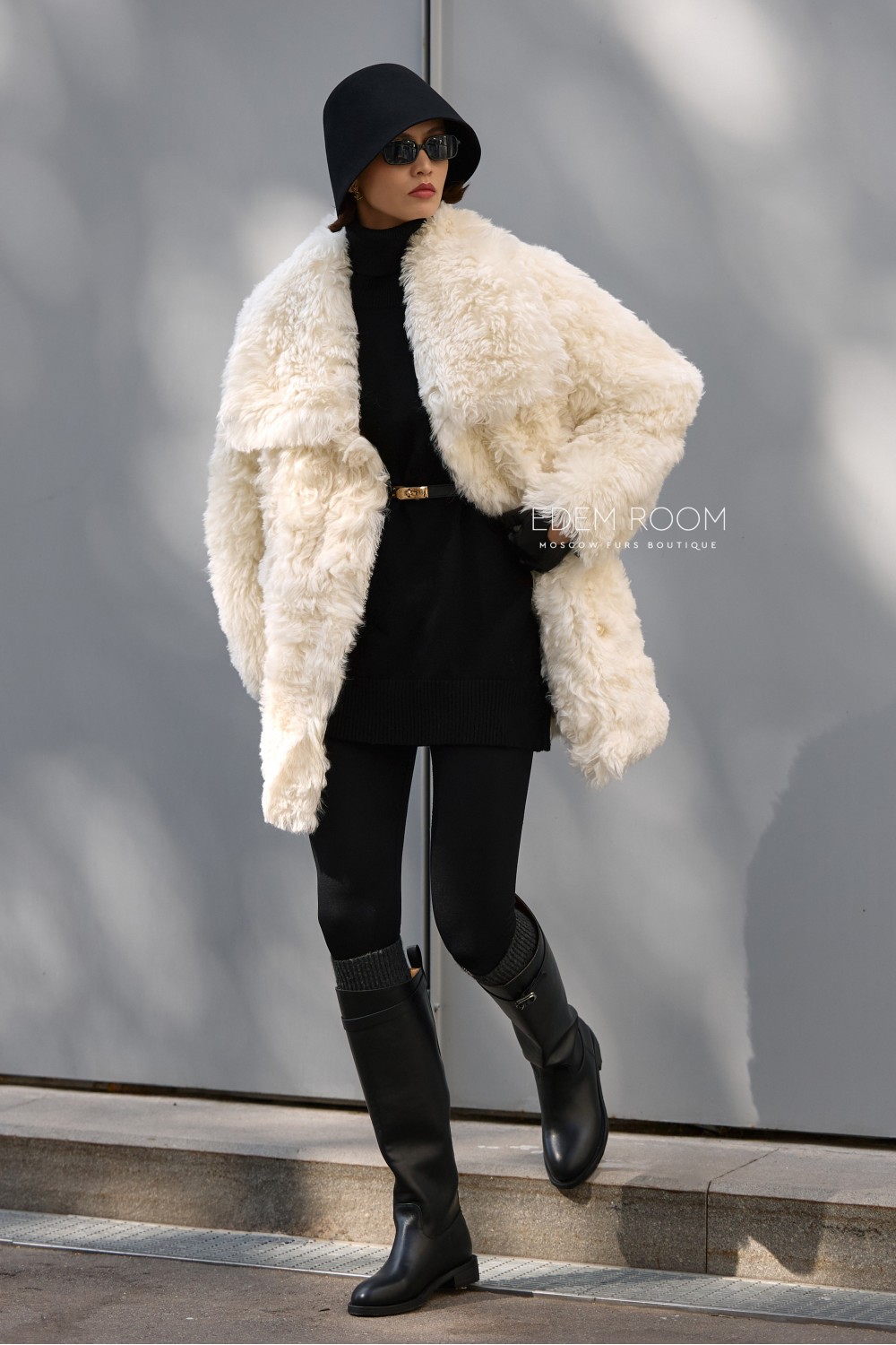 Длина шубы 75–80 см — универсальная и очень удобная, она прекрасно подходит для активного образа жизни, не сковывает движения и гармонично смотрится как с брюками, так и с платьем или юбкой. Ванильный цвет придаёт изделию особую элегантность и визуальную лёгкость. Кроме того, модель доступна и в других оттенках — графит, шоколадный и чёрный, что позволяет подобрать вариант под индивидуальный стиль.