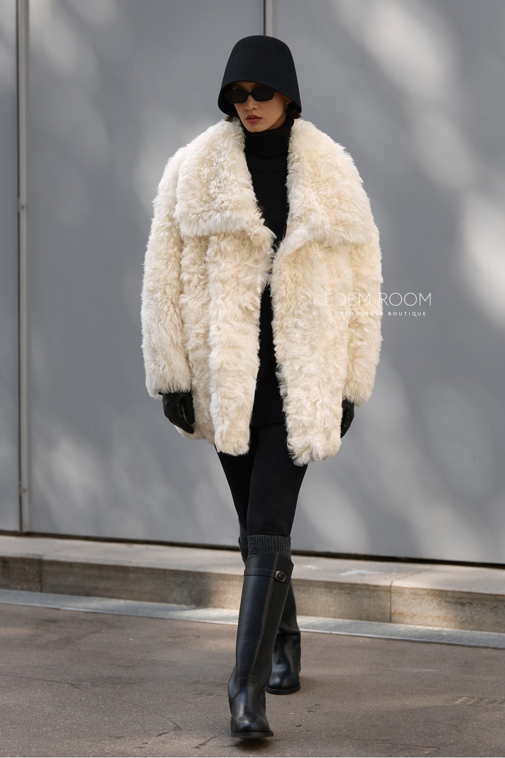 Особое внимание привлекает большой эффектный воротник, который не только защищает от холода, но и служит акцентным декоративным элементом. Его мягкие линии подчёркивают женственность силуэта и делают образ выразительным.