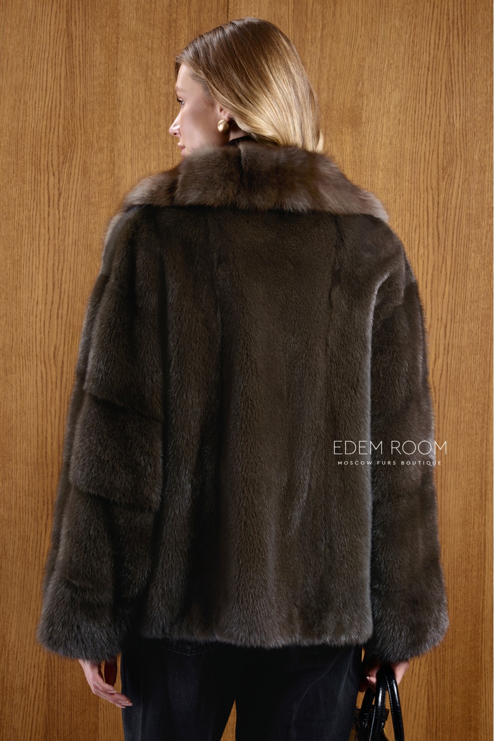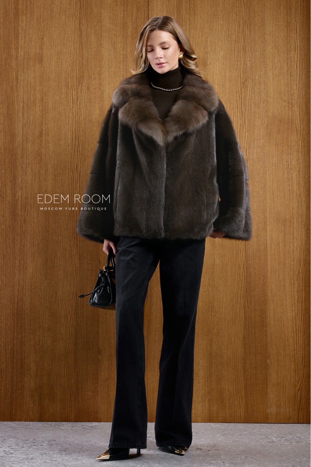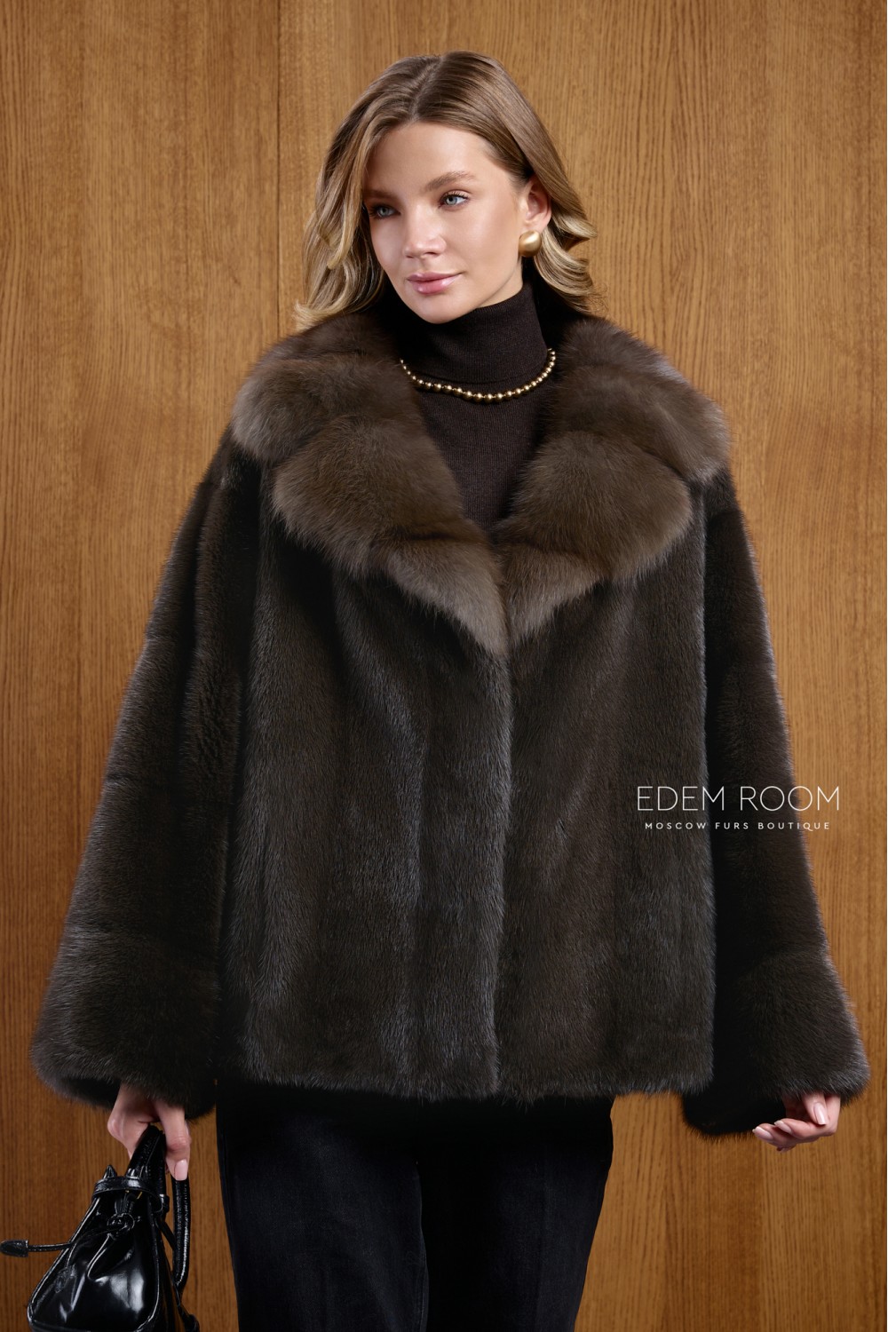 короткая норковая шуба с воротником из куницы WR-7026-65-SB-KN