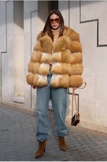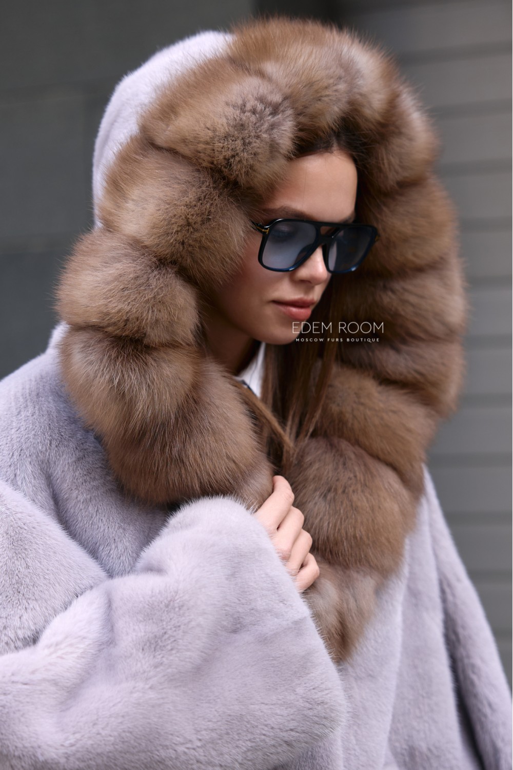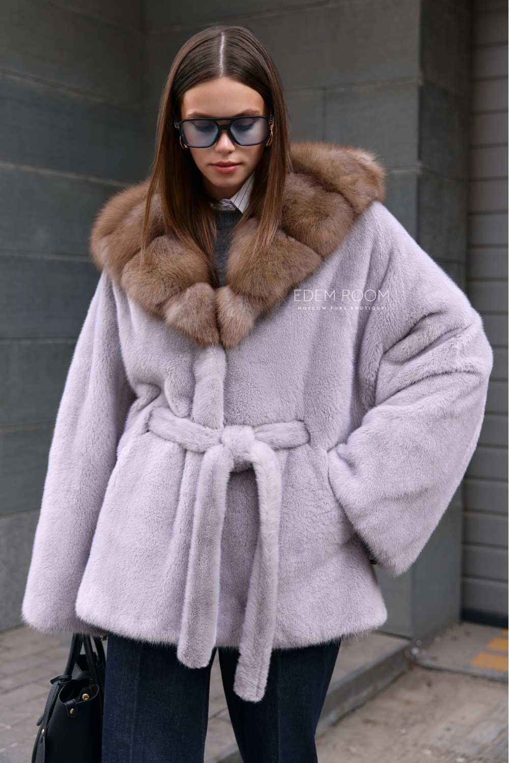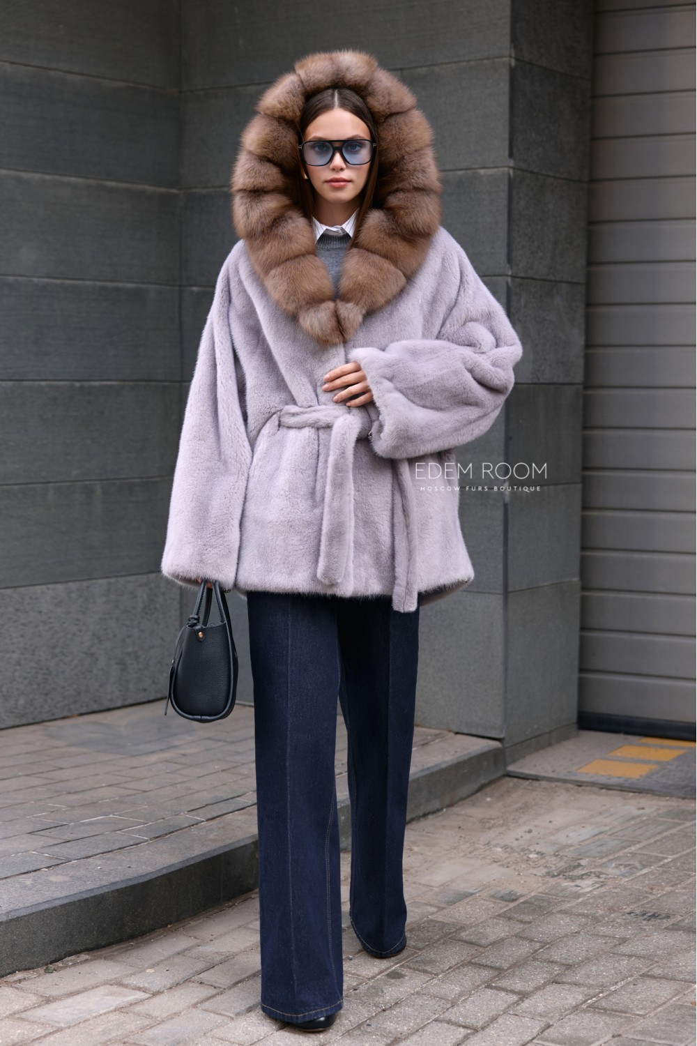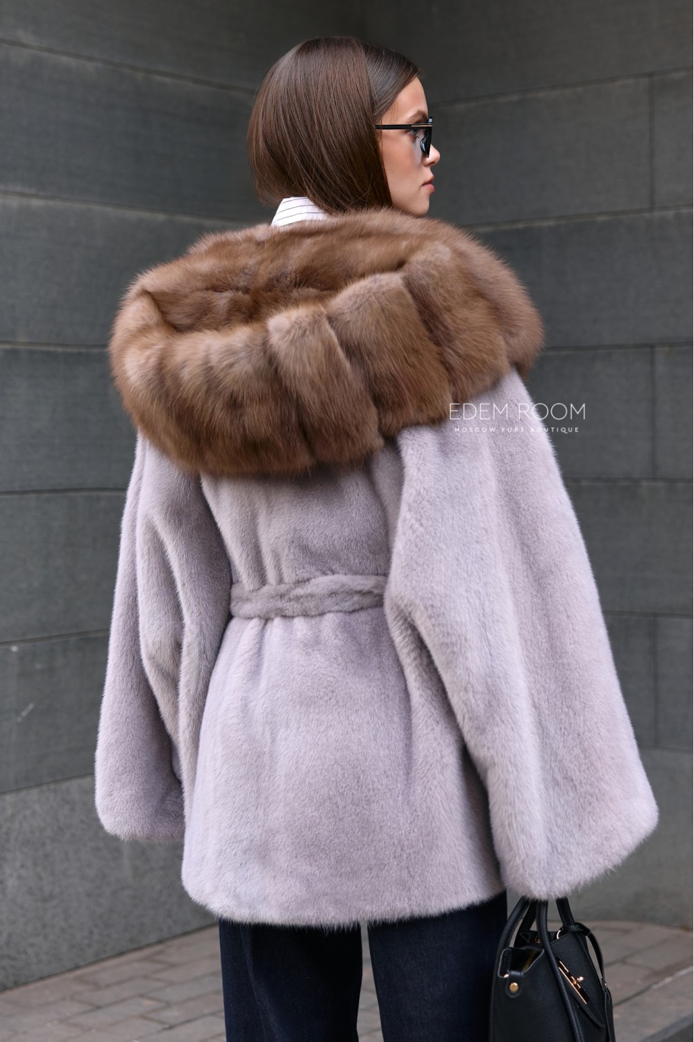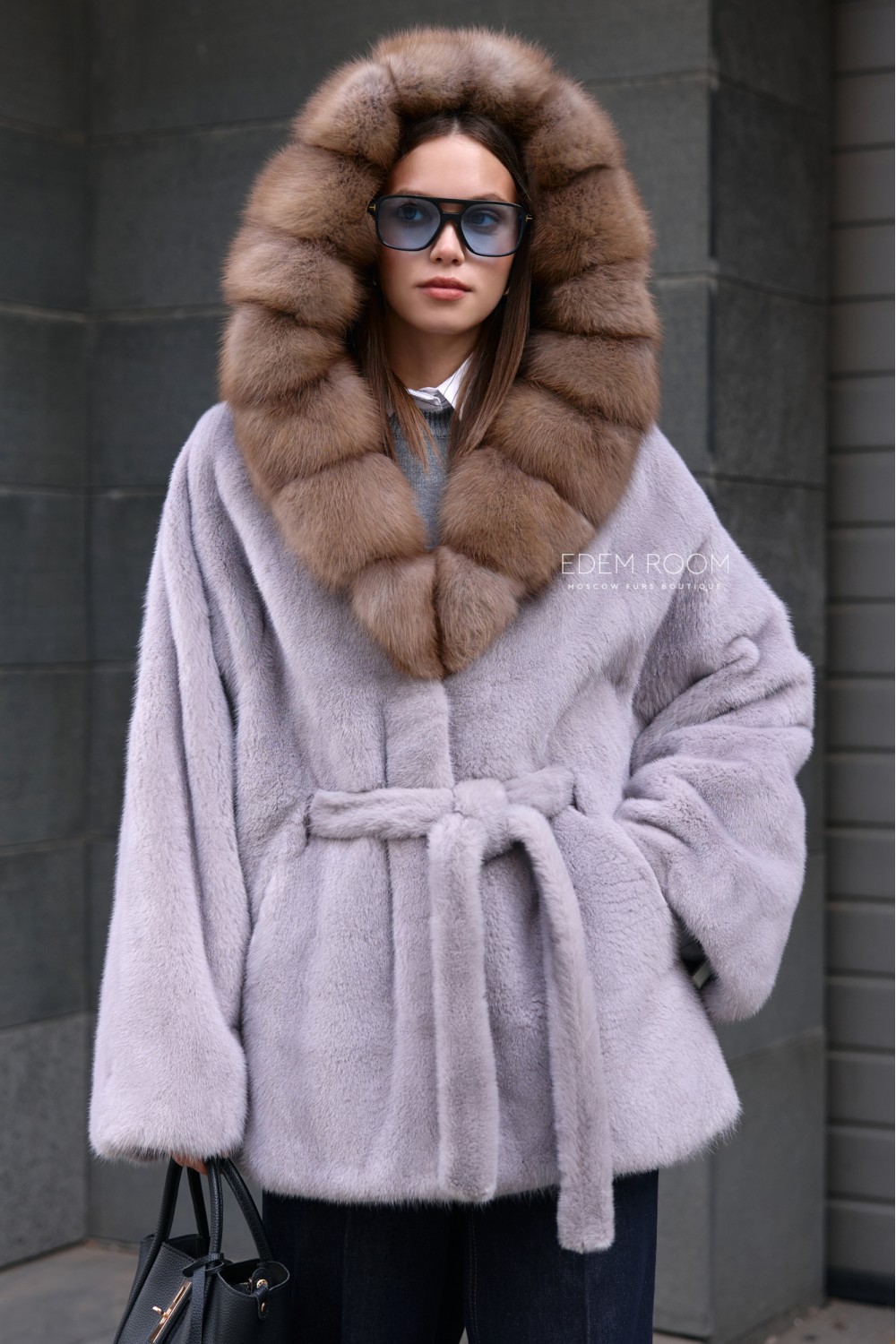 норковое пончо под пояс с куницей NF-8026-2-75-LV-KN