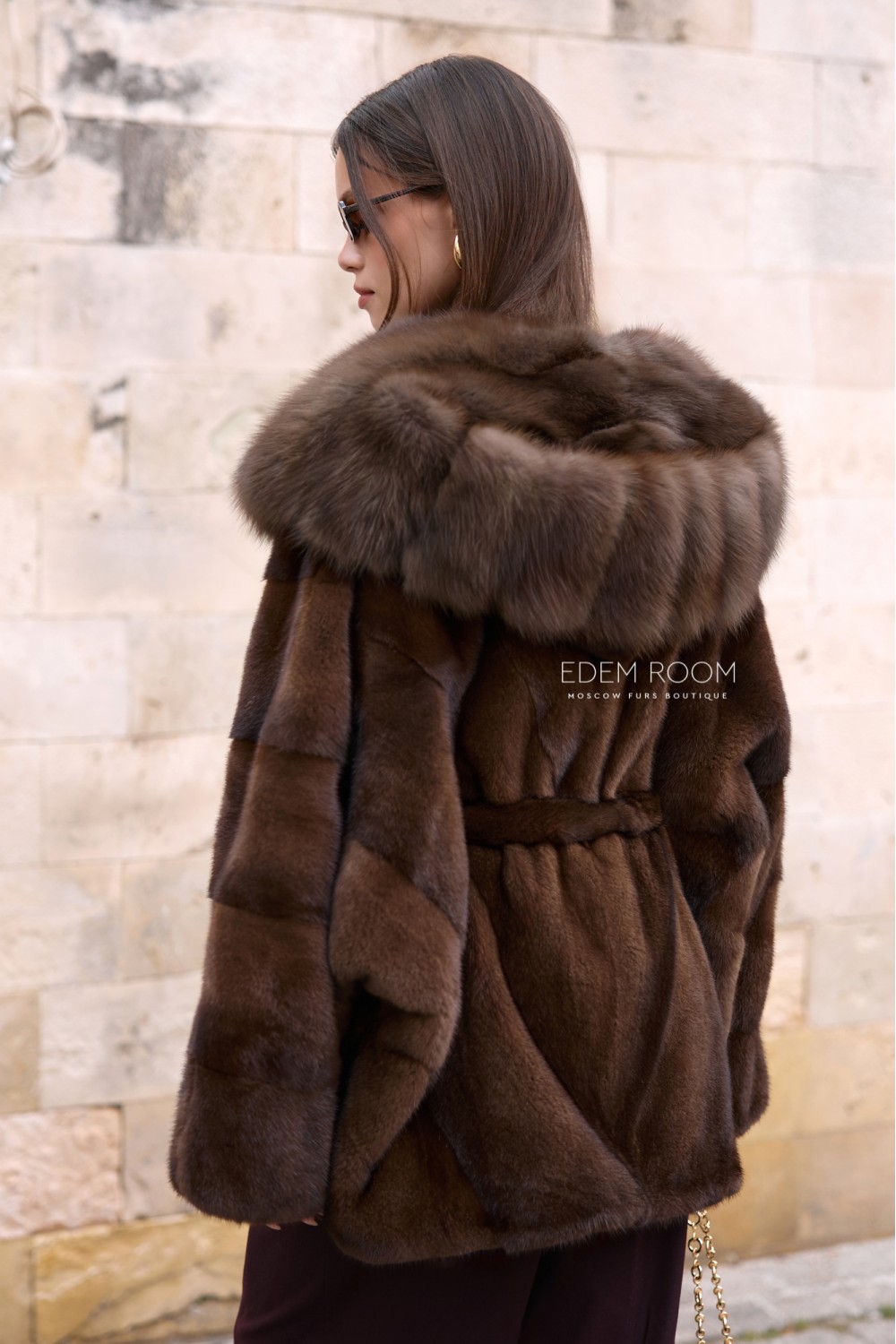 коричневый норковый полушубок с мехом куницы NF-8023-2-75-OR-KN