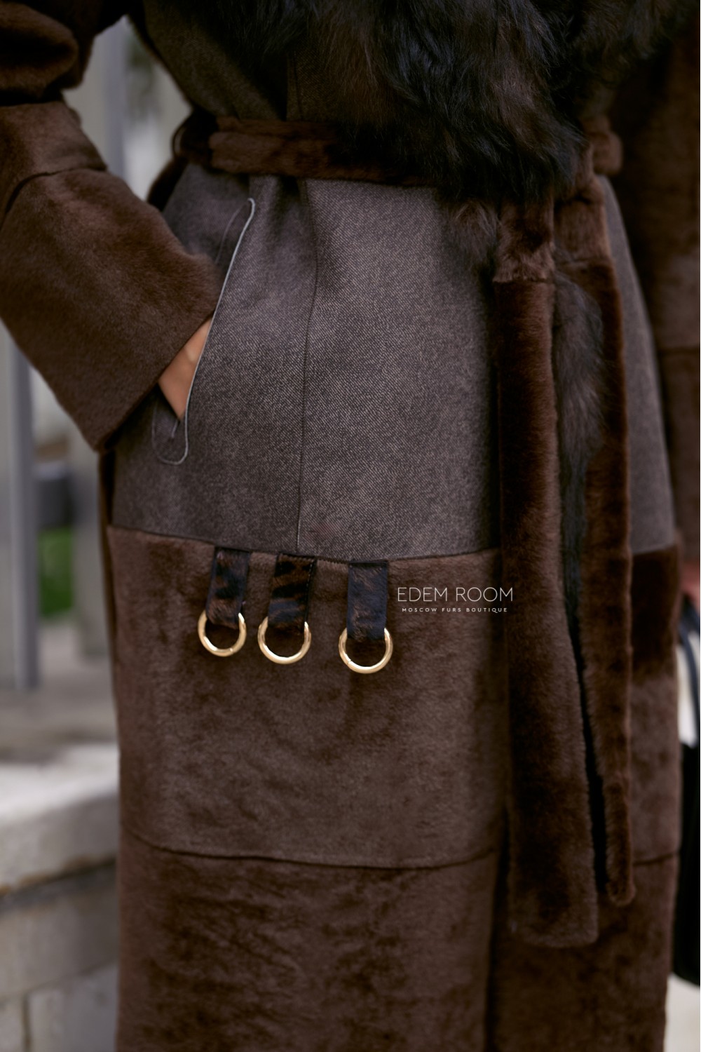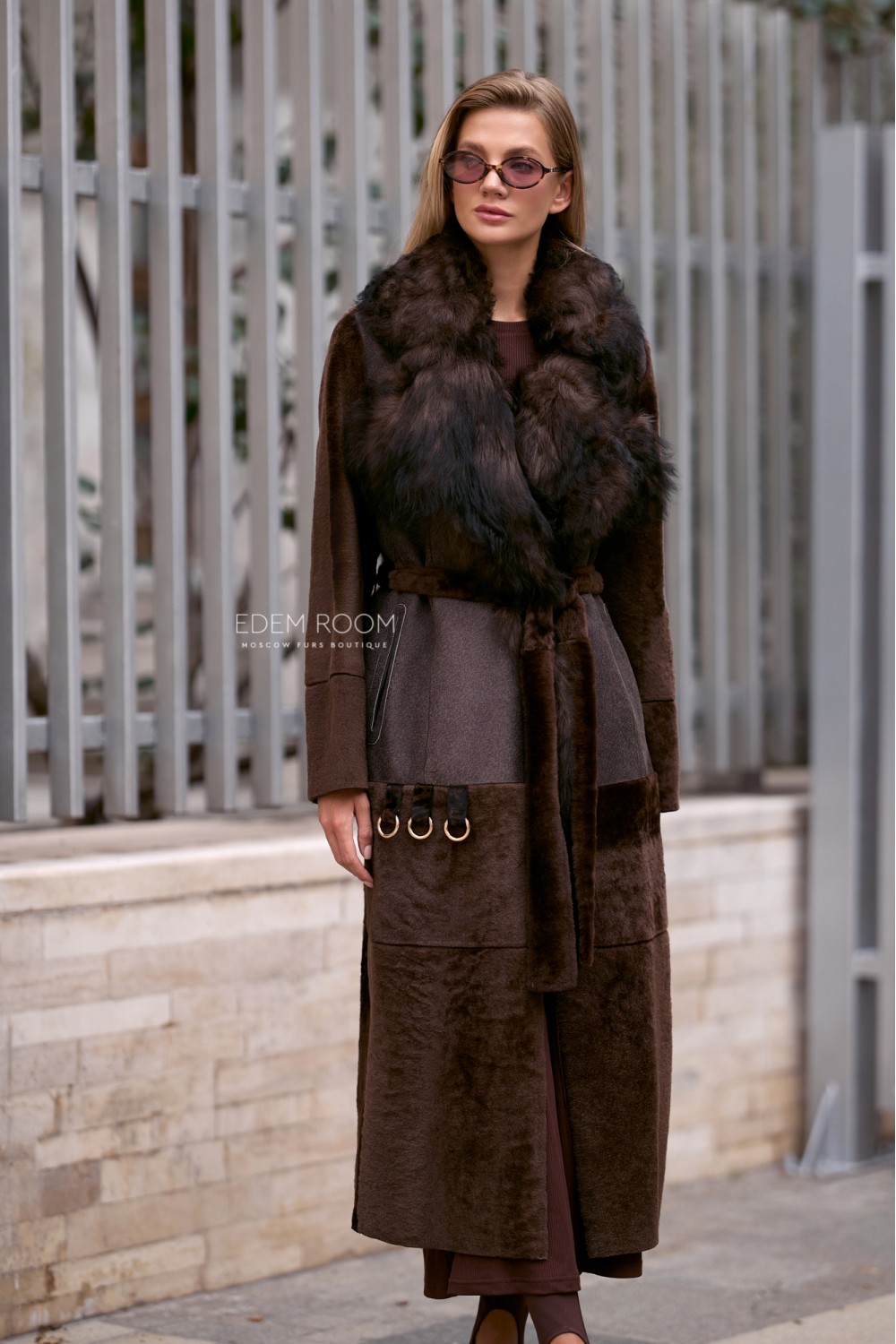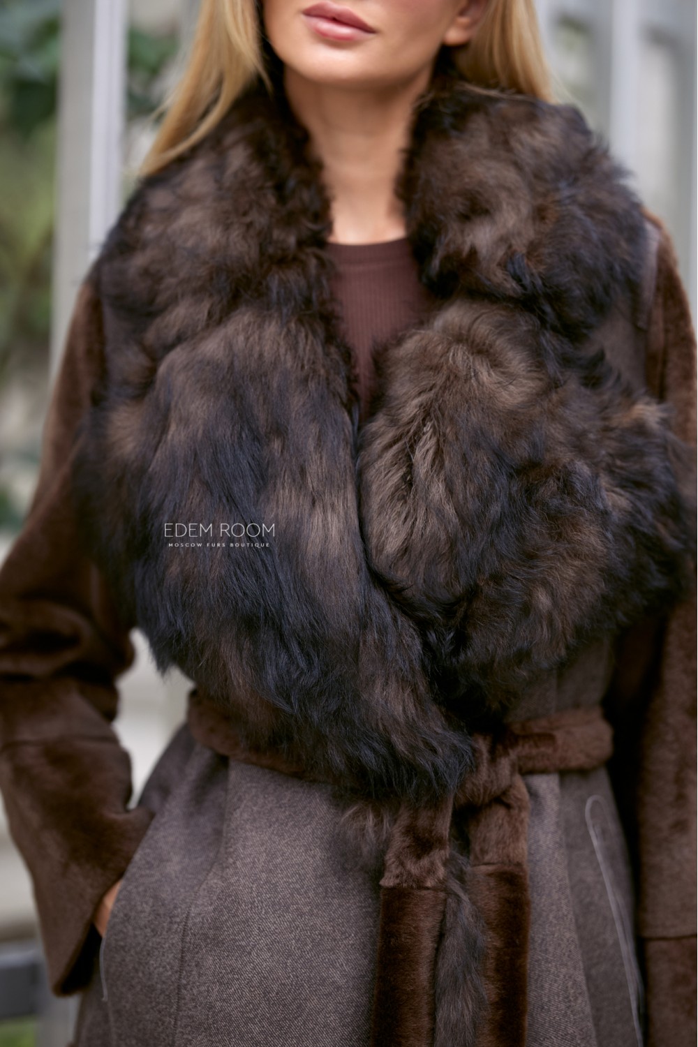 В качестве основного материала используется мех cortos, полученный по уникальной технологии выстригания меха до «гладкого ворса», что придает изделию приятную, бархатную текстуру. Воротник, пошитый из роскошного меха испанской овчины тиградо, привносит в образ экстравагантность и привлекает восхищенные взгляды окружающих. Внутренняя отделка изделия - нежная кожа ягненка коричневого цвета. Она не только обеспечивает максимальный комфорт, но и также дарит приятные тактильные ощущения.