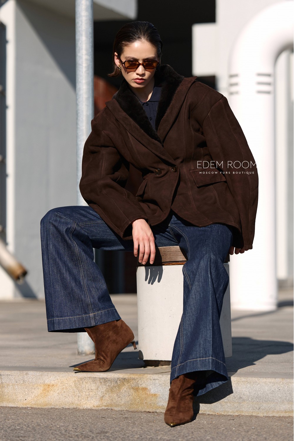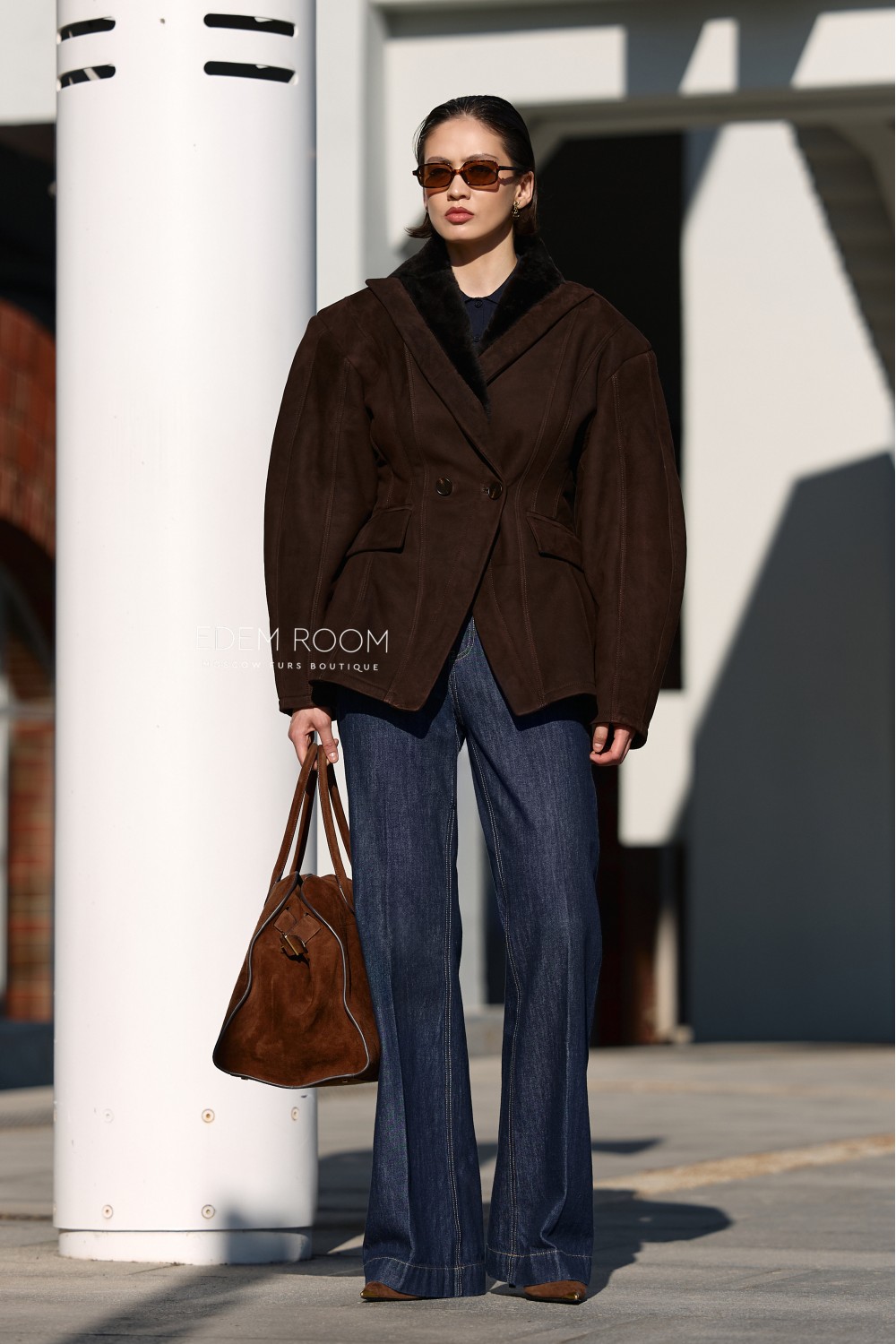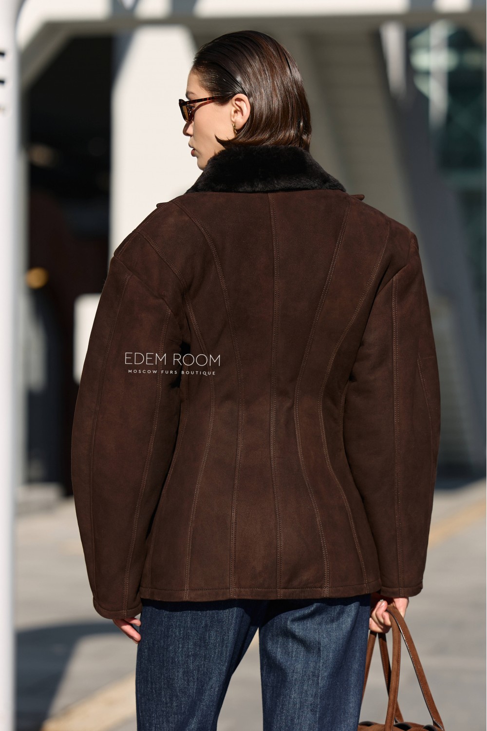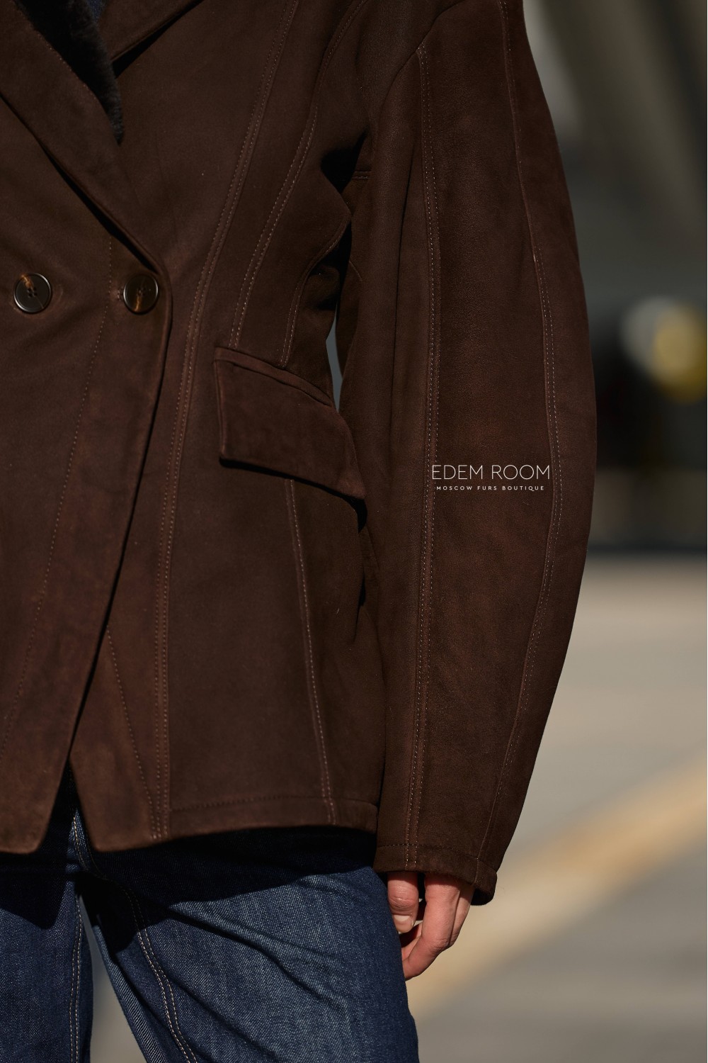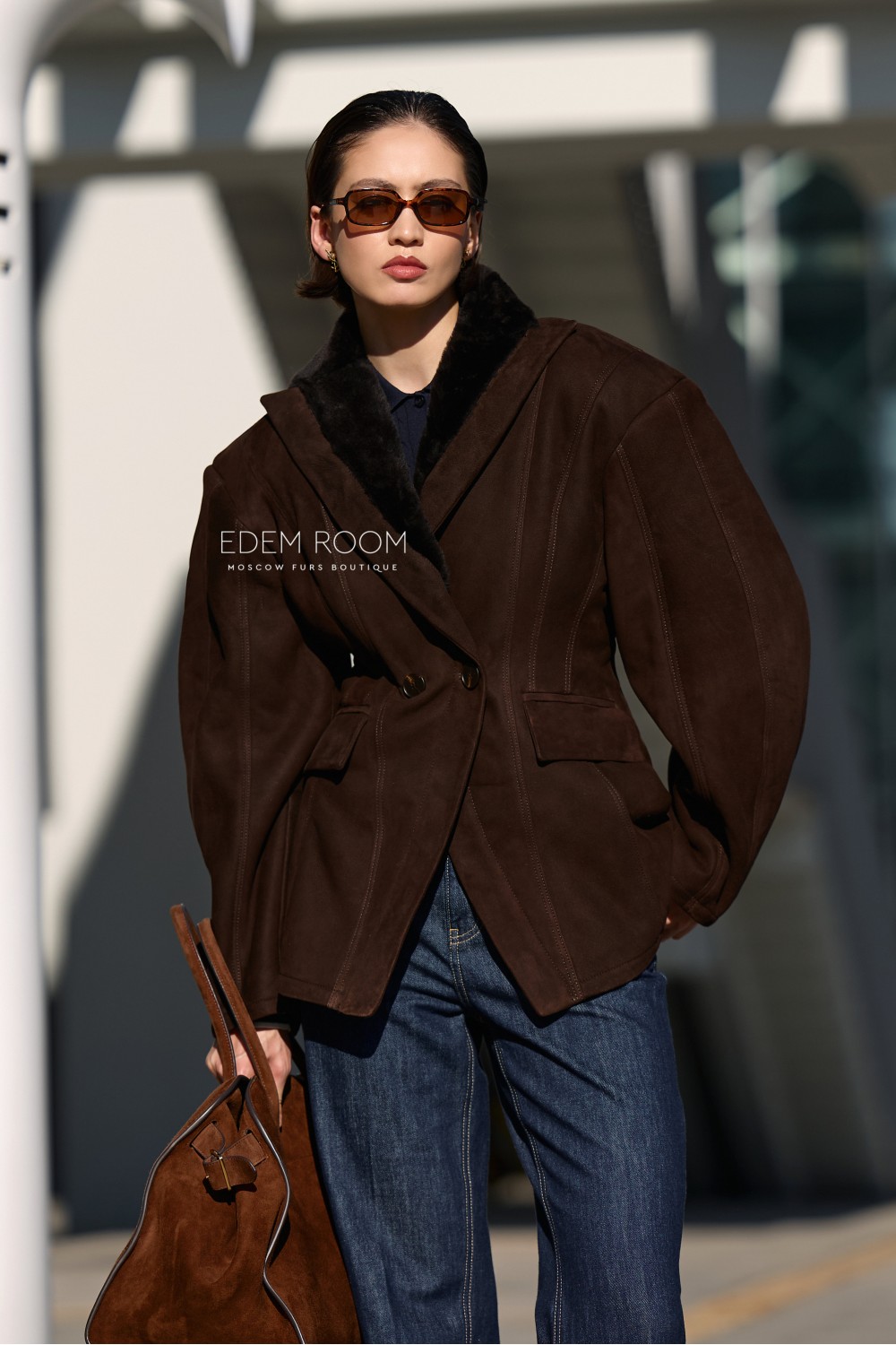 Ключевая особенность модели — приталенный силуэт, подчёркивающий женственность и элегантность. Расширенные плечи с эффектом «фонариков» придают образу выразительность и делают акцент на линии верха, формируя гармоничные пропорции фигуры. Пиджак застёгивается на аккуратную пуговицу, а отложенный воротник с мягкой меховой отделкой добавляет образу изысканности и визуального объёма.