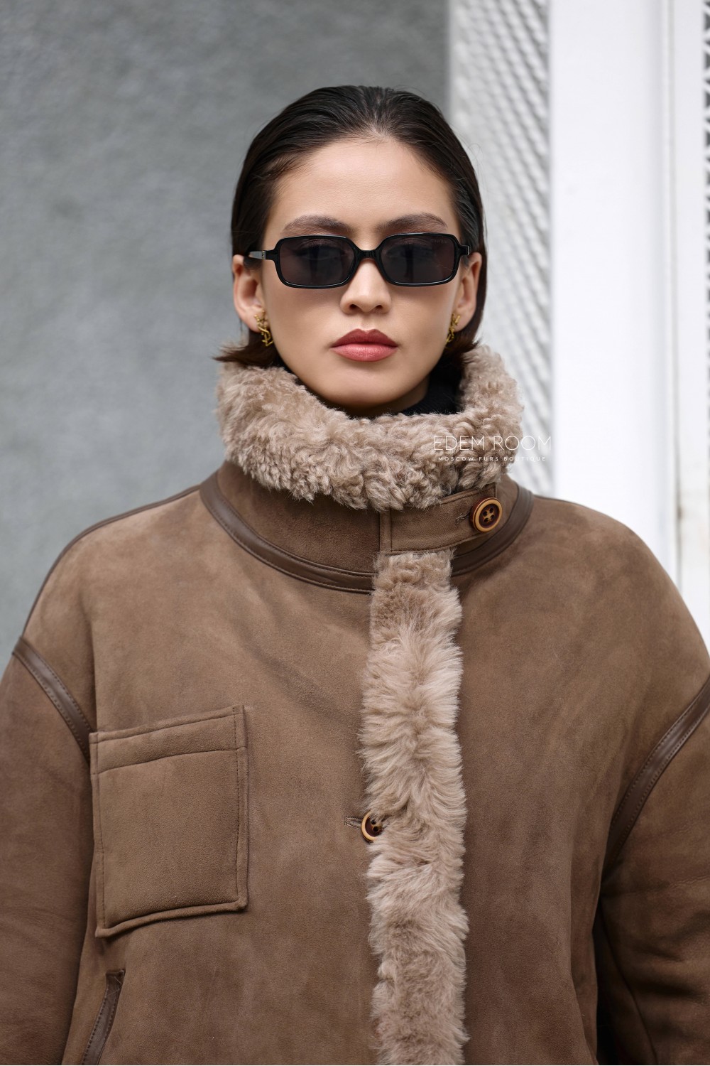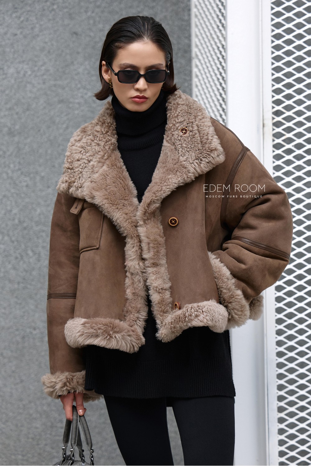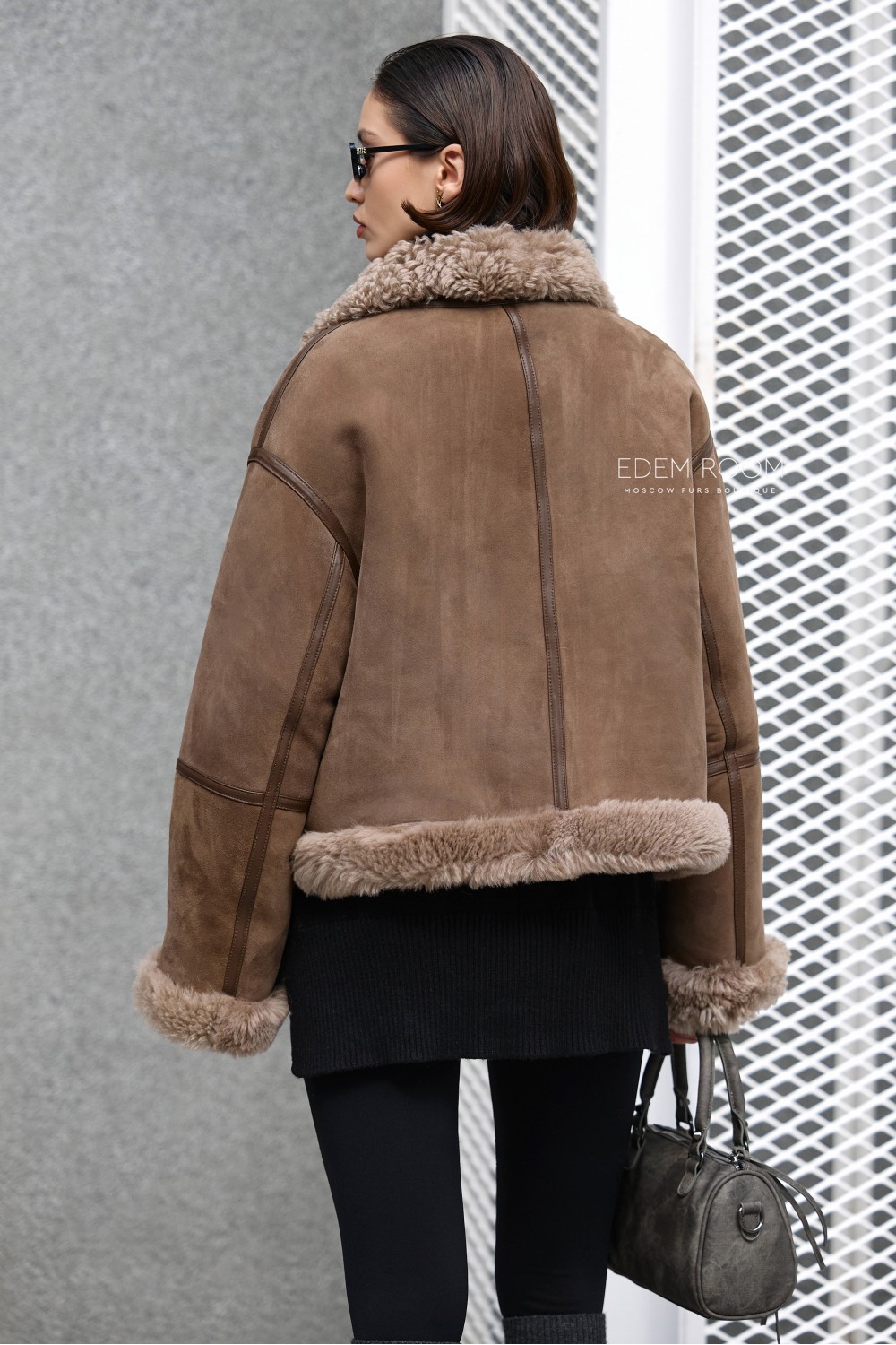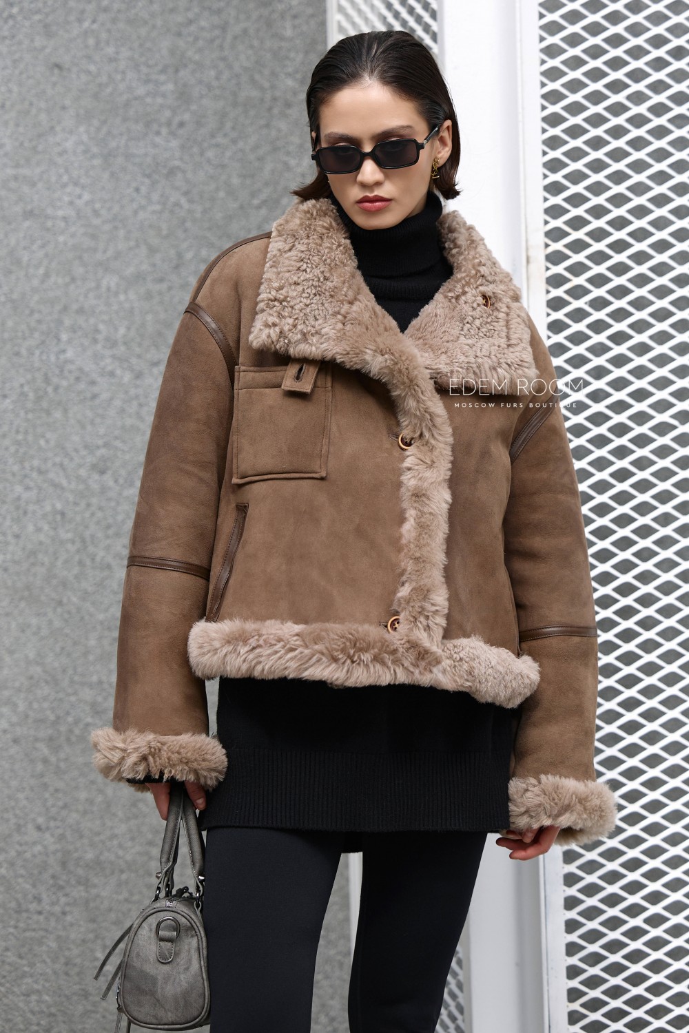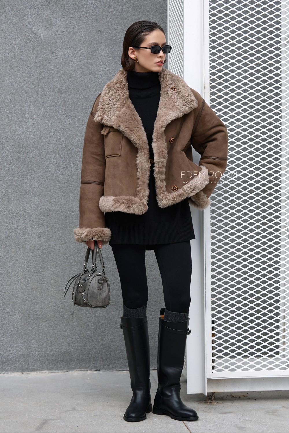 Длина изделия — 55 см, что делает его особенно удобным для повседневной носки и сочетания с различными элементами гардероба. Куртка не утяжеляет силуэт, придаёт образу динамику и подчёркивает фигуру, оставаясь при этом максимально тёплой. Модель имеет свободный крой, что позволяет с лёгкостью надевать её поверх объёмных свитеров или плотных костюмов. Дизайн продуман до мелочей: широкие отвороты и воротник из меха тиградо придают изделию выразительность и фактурность, контрастируя с гладкой замшевой поверхностью. Меховая отделка также присутствует по краю низа и на манжетах, создавая мягкую и уютную окантовку. Застёжка на пуговицы подчёркивает лаконичность и аккуратность кроя.