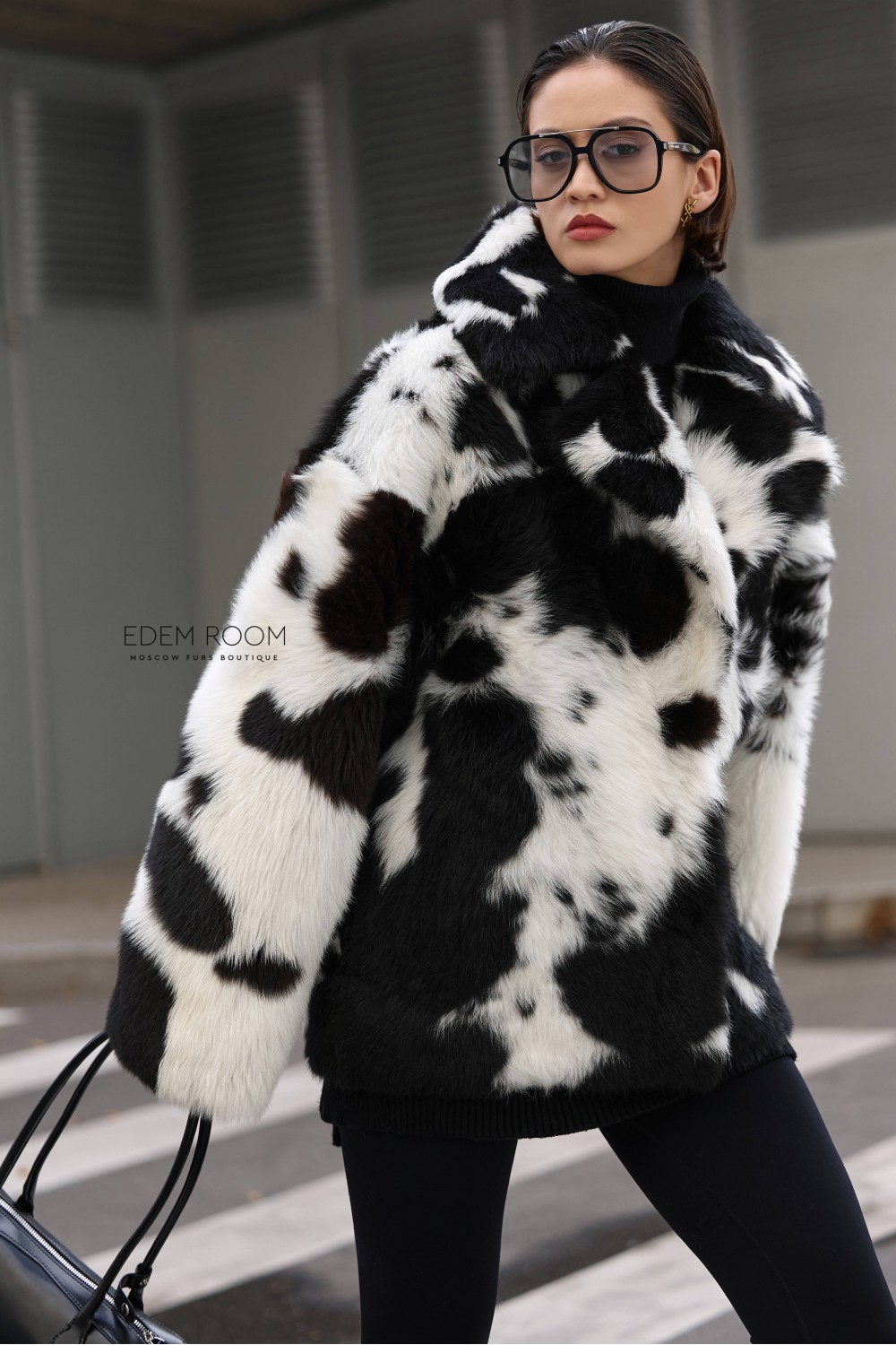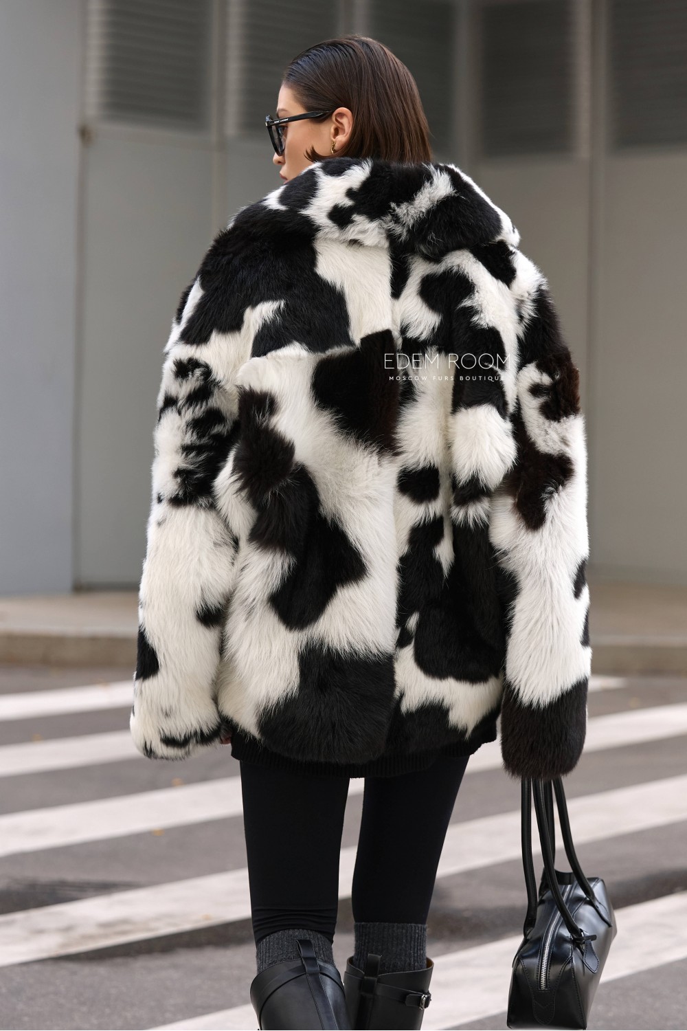 Главная особенность этой модели — эффектный принт, имитирующий рисунок коровьей шкуры. Чёрно-белая гамма образует яркий контраст и делает образ по-настоящему запоминающимся. Такой дизайн подойдёт для уверенных в себе девушек, которые любят смелые решения и не боятся быть в центре внимания. Крой у модели достаточно простой и лаконичный, что позволяет подчеркнуть выразительность самого материала. Свободный силуэт обеспечивает комфорт в движении и возможность сочетания с разной одеждой — от плотных свитеров до легких трикотажных платьев. Мех тосканы мягкий, пушистый и приятный на ощупь, а кожа снаружи выглядит стильно и дорого.
