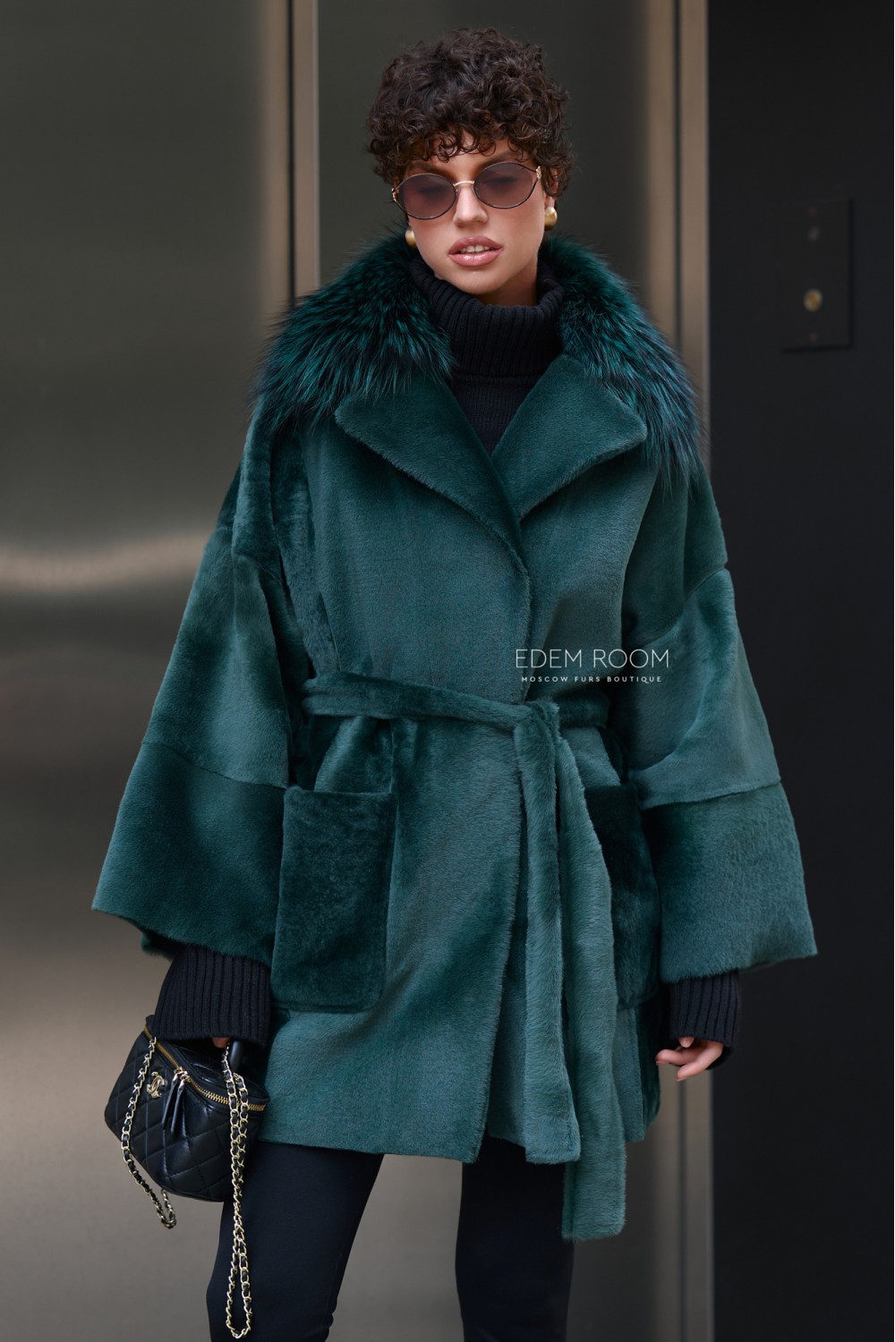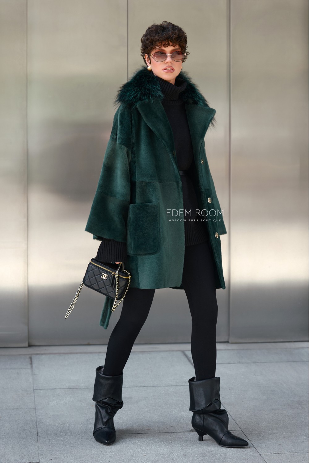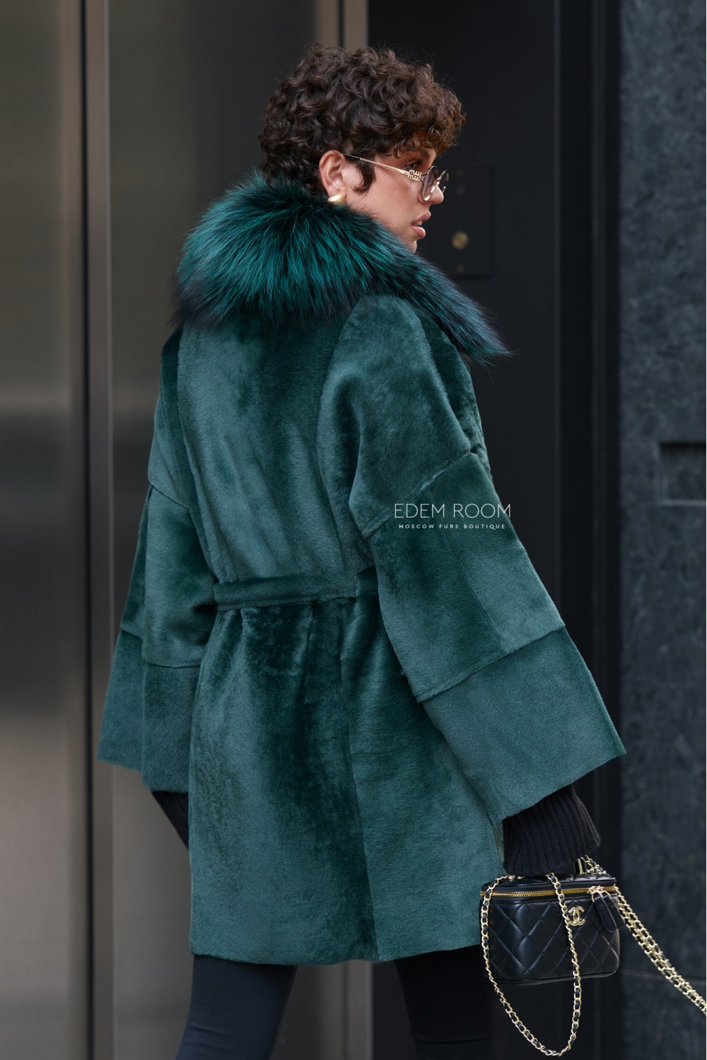 Материалом верха служит овчина, обработанная по технологии cortos. Эта уникальная выделка подразумевает стрижку меха до «гладкого ворса», что придает пальто изысканный вид и обеспечивает дополнительную защиту от ветра и влаги. Модель имеет съемный воротник из роскошного меха лисы. Внутри пальто отделано нежной кожей ягненка изумрудного цвета, что создает ощущение роскоши и комфорта при каждом прикосновении.
