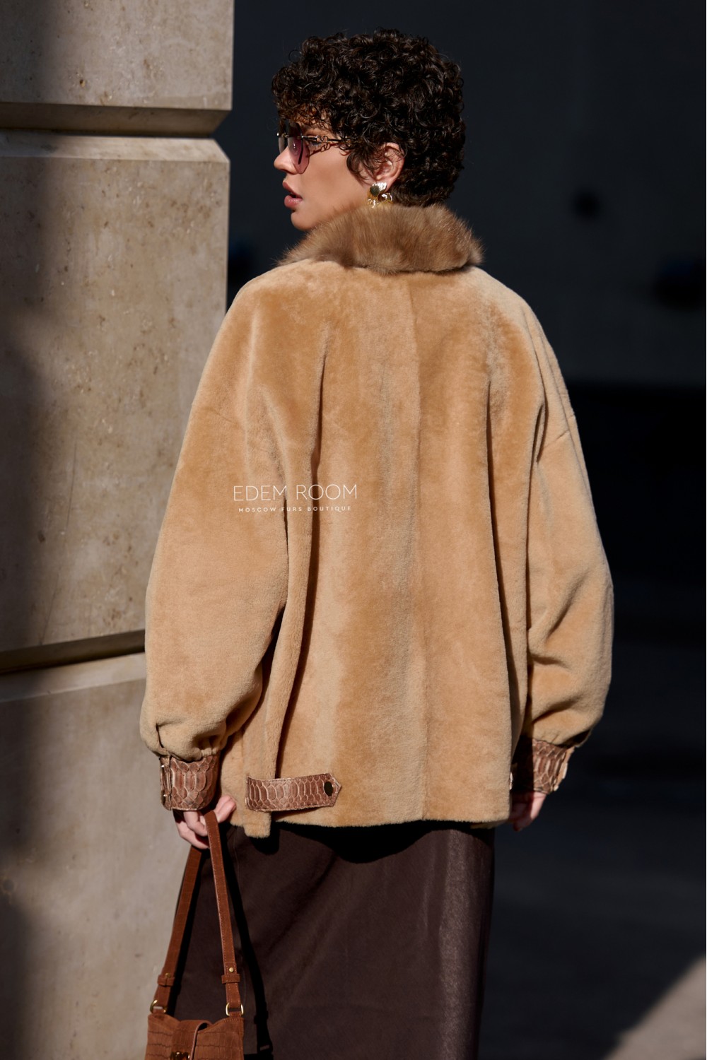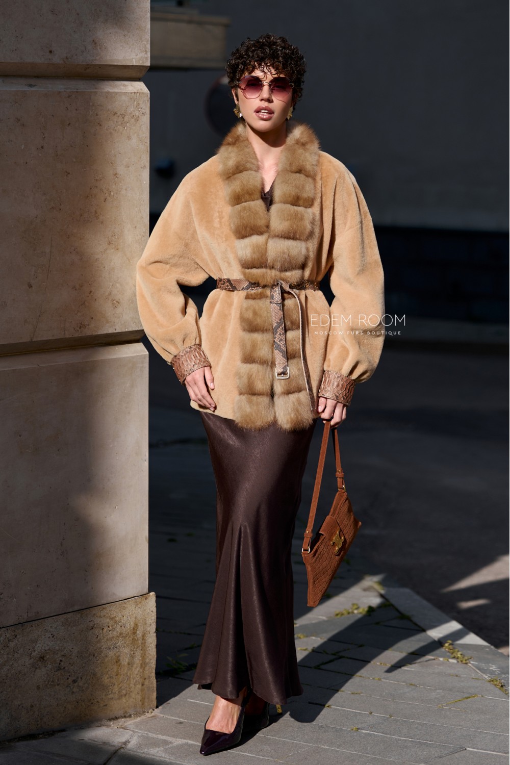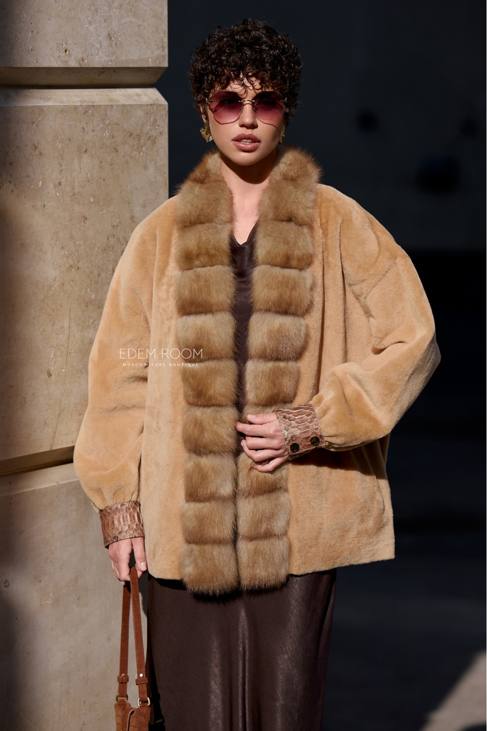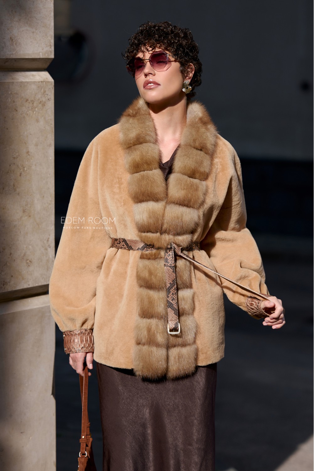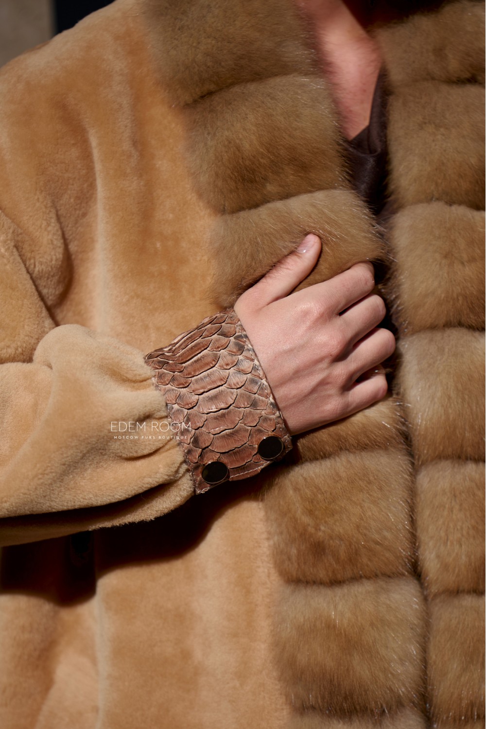 Внутренняя отделка выполнена из нежной итальянской кожи ягнёнка, дарящей ощущение уюта и мягкости. Длина изделия варьируется от 65 до 70 см, при необходимости возможна корректировка по индивидуальному заказу. Базовый цвет модели - благородный кэмел, при этом по запросу доступны и другие оттенки. Размерный ряд представлен от 42 до 62, что позволяет подобрать идеальный вариант для разных фигур. Производство осуществляется в России с использованием итальянских материалов и технологий. Эта шубка гармонично сочетает классику и современные детали, оставаясь универсальной и при этом выделяющейся в любом гардеробе.