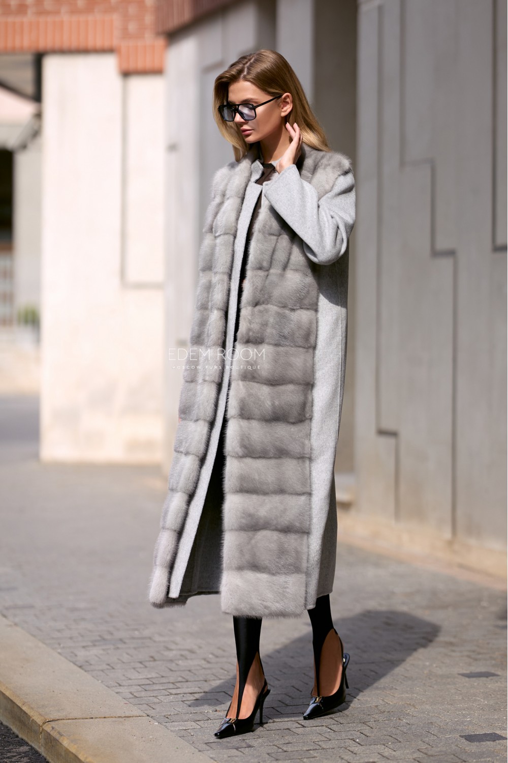 Для изготовления этого пальто используется премиальная ткань, состоящая из 80% шерсти и 20% кашемира. Это сочетание обеспечивает исключительную мягкость, тепло и долговечность. Шерсть прекрасно сохраняет тепло, а кашемир придает ткани нежность и приятные тактильные ощущения. Съемная жилетка, выполненная из импортной норки, добавляет образу роскоши и гламура. Высококачественный мех отличается густым, блестящим ворсом и превосходными теплоизоляционными свойствами.