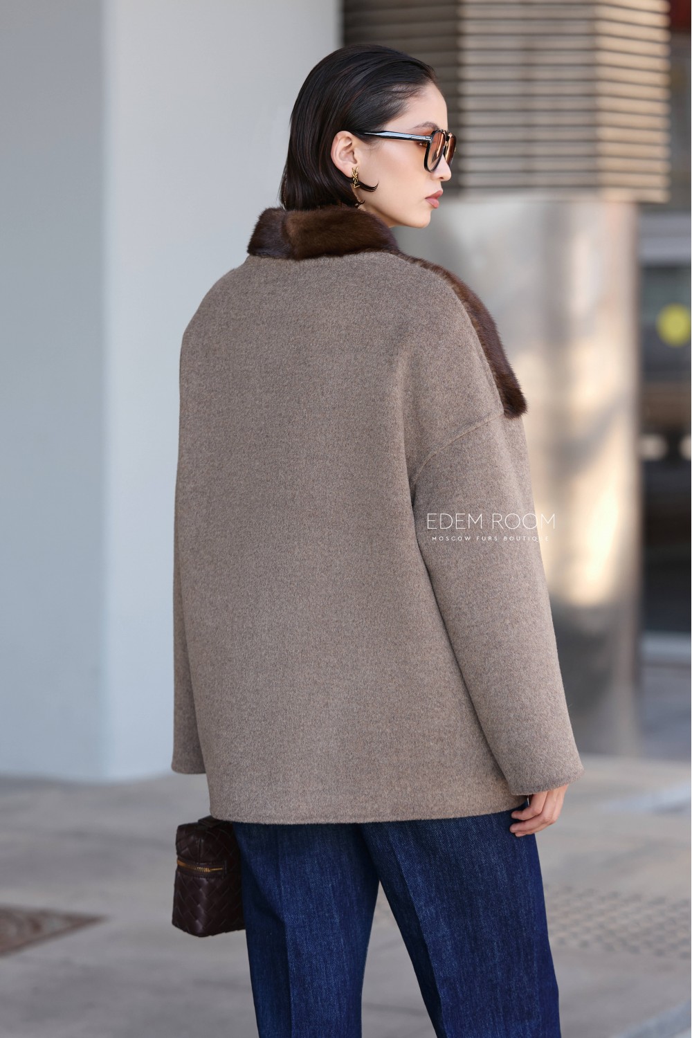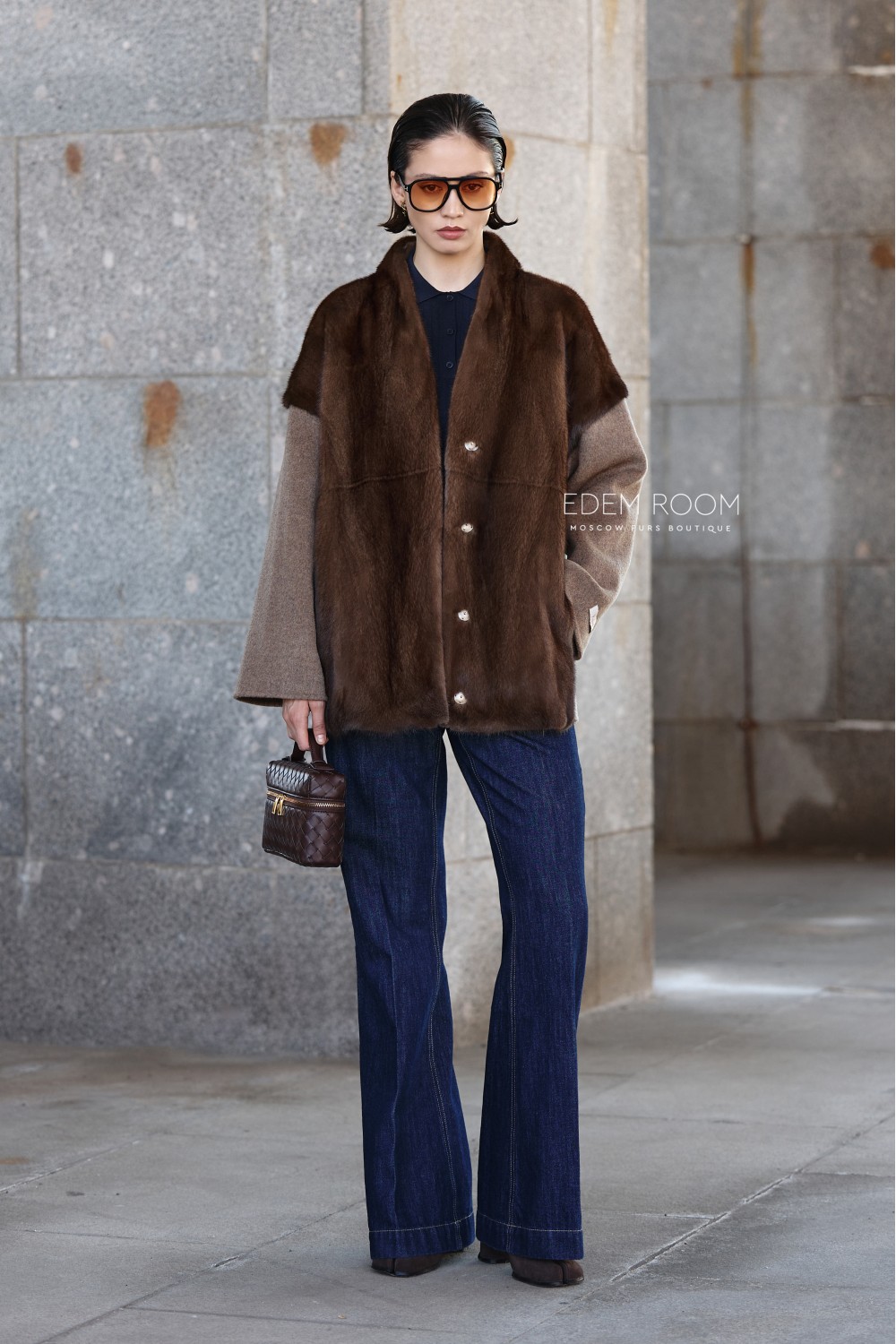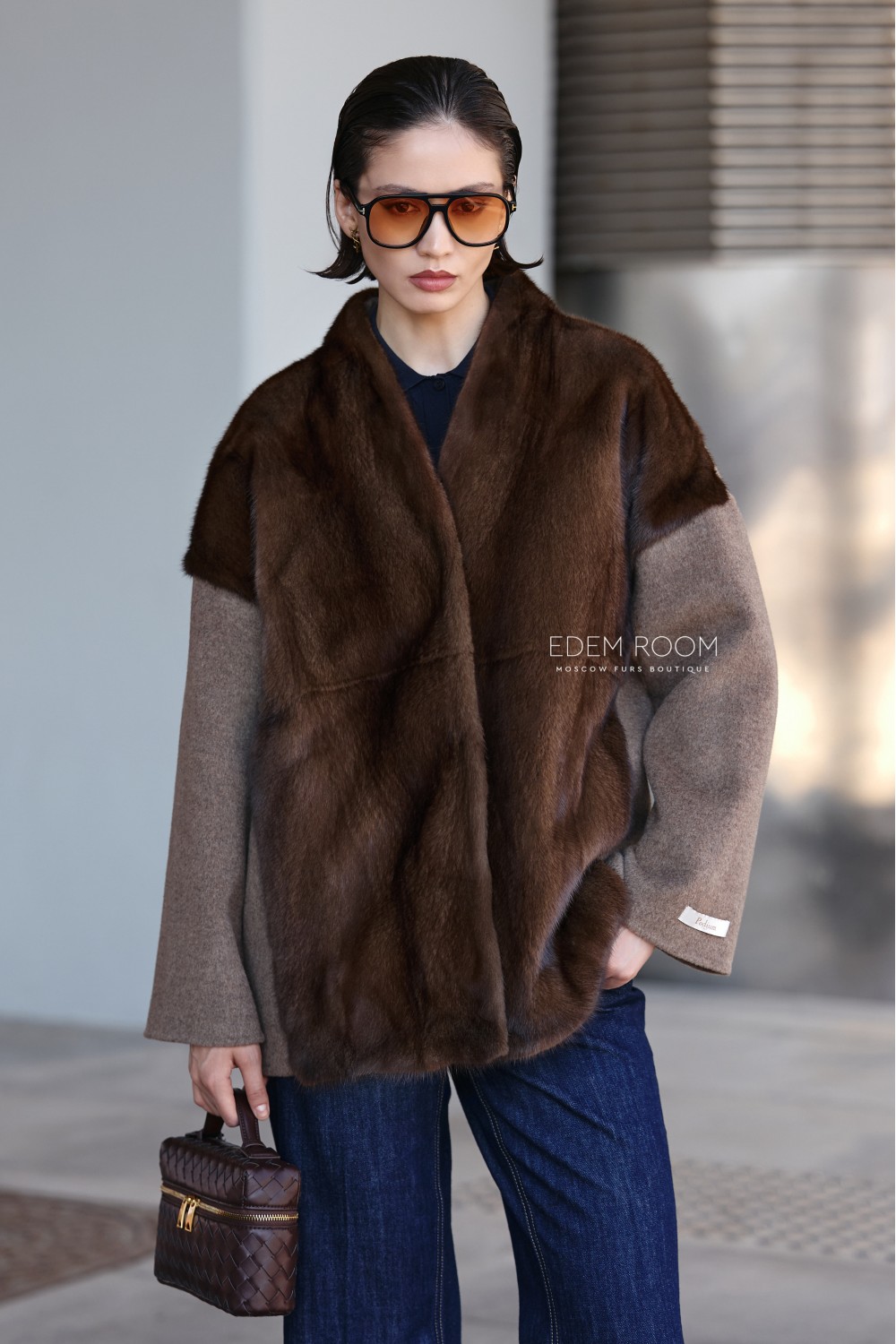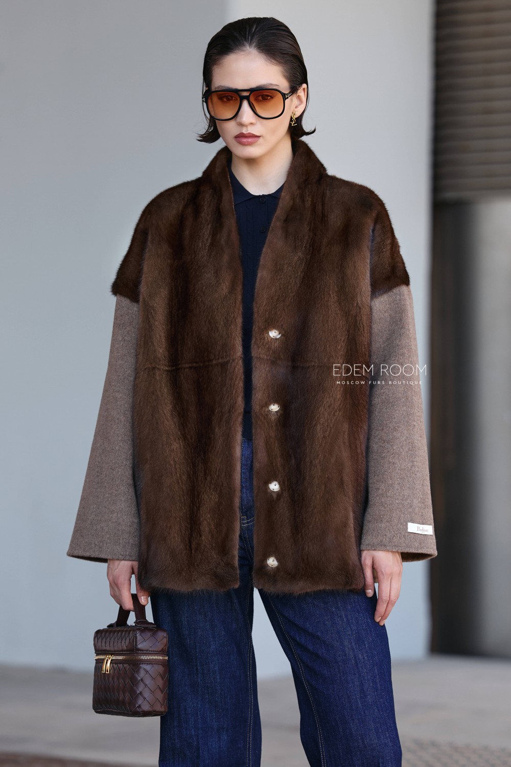 Главной особенностью этой модели является оригинальное сочетание двух материалов: основная часть изделия выполнена из густого, блестящего меха норки, который обеспечивает тепло и визуальную насыщенность образа, а рукава — из плотной шерсти, создающей контраст по фактуре и оттенку. Такое решение делает силуэт интересным и выразительным, добавляя объём и глубину. Цвет куртки — благородный коричневый, но по желанию возможны и другие варианты оттенков.