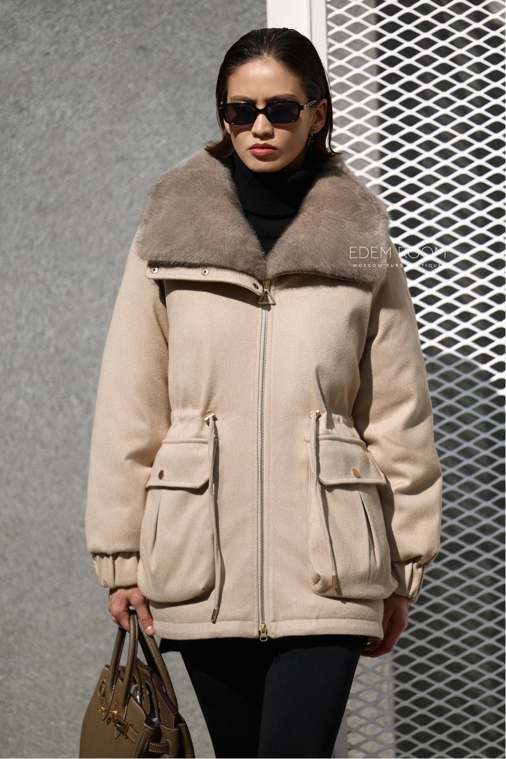 Отдельного внимания заслуживает съёмный меховой воротник из натуральной норки. Он выполнен в благородных тонах — бежевом или коричневом — и добавляет образу аристократичности. Меховой элемент придаёт модели особый шарм и теплоту, а при необходимости его можно снять, оставив более лаконичный вариант для повседневной носки.