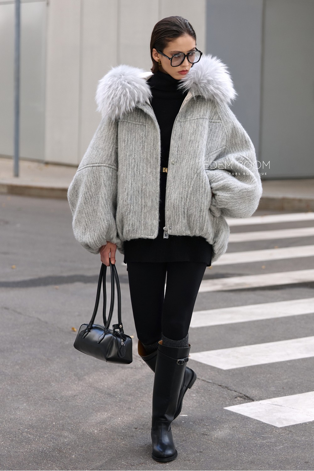 Длина пуховика составляет 75–80 см - удобная средняя длина, подходящая для любых погодных условий. Объёмный меховой воротник из натурального енота придаёт модели выразительность и визуальный объём, а также защищает от ветра и холода. Мех на капюшоне съёмный, что позволяет адаптировать изделие под разные погодные условия и образы - от повседневного городского до более элегантного.